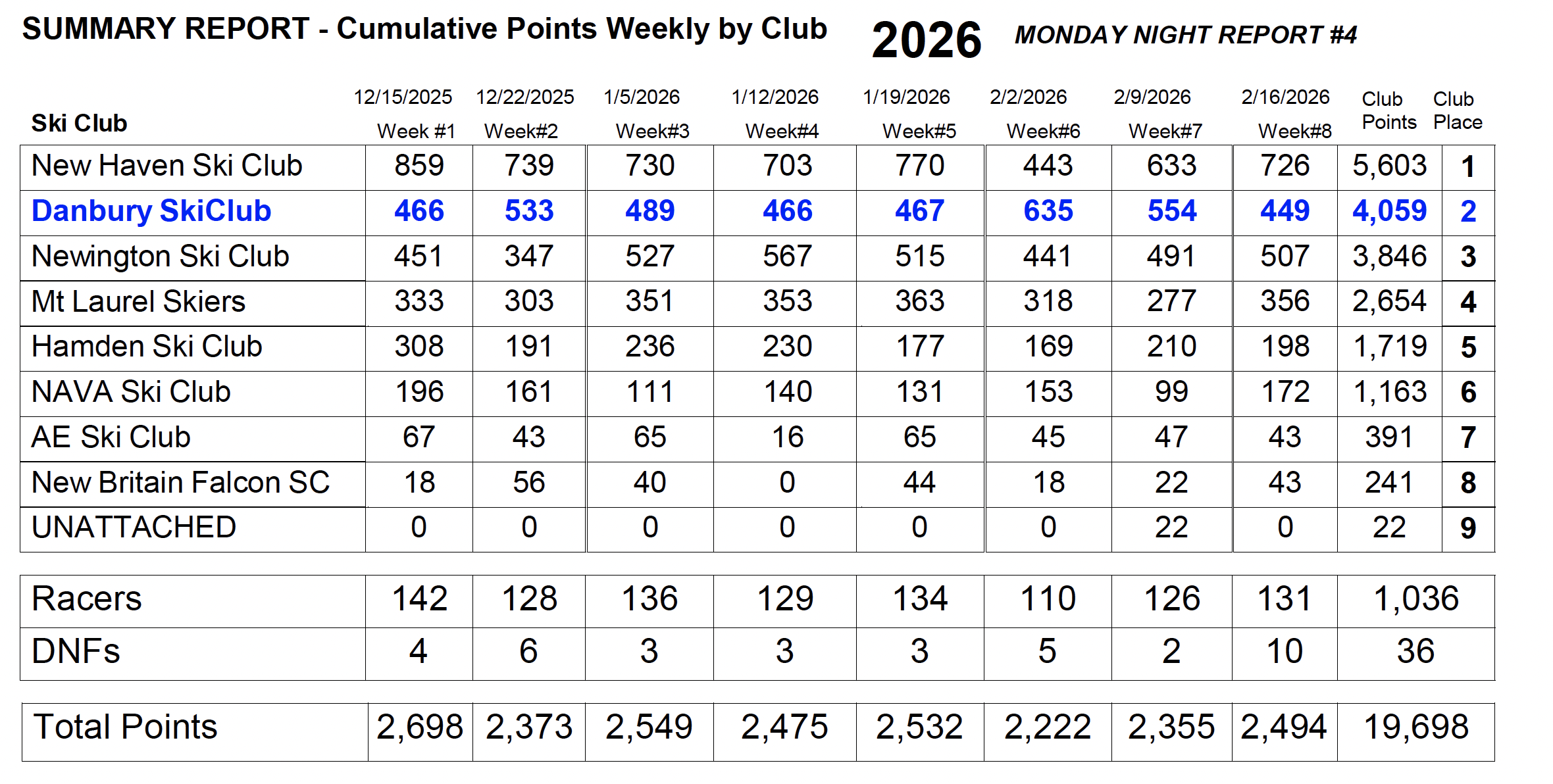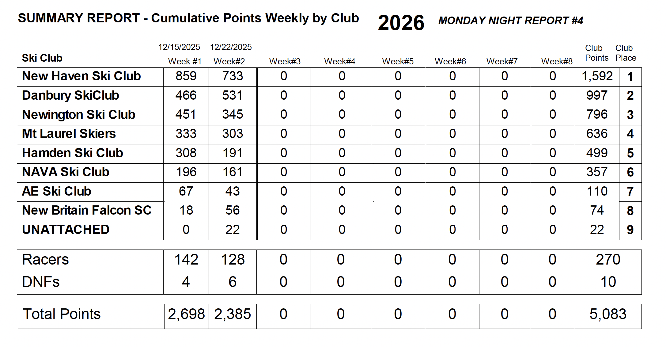 If you have registered for a race, come to Southington to get your bib for the first time you race, or possibly get it on pizza night on Monday December 9. If you do not make the pizza night make sure you come early to your first night of racing to get your bib, on the first night there is typically a backup.